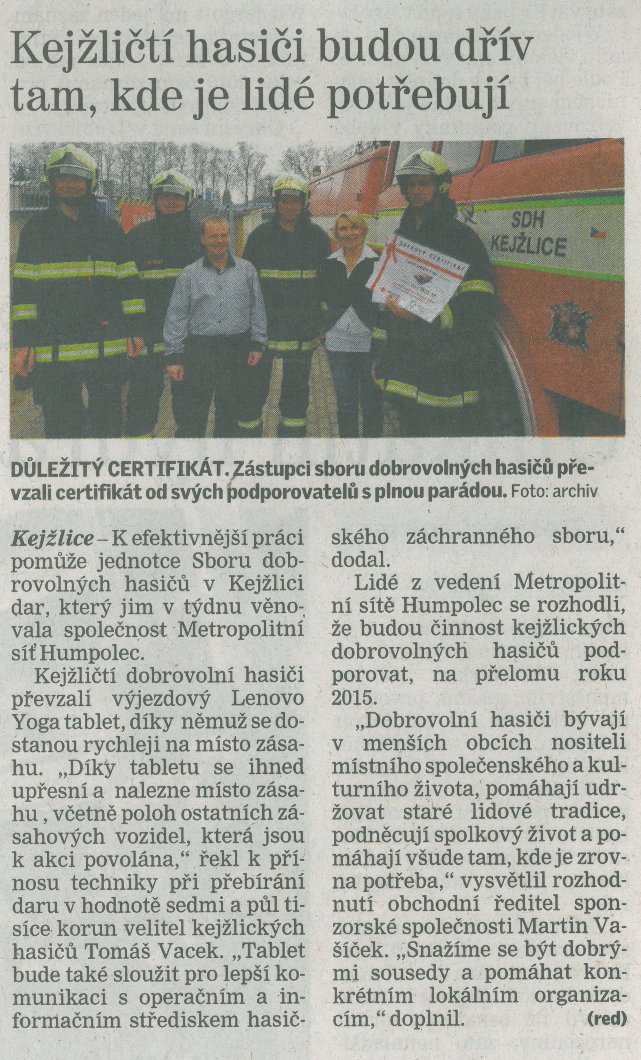 Pelhřimovský deník dne 19.3.2016 - Kejžličtí hasiči budou dřív tam, kde je lidé potřebují. Článek o předání techniky pro SDH Kejžlice v rámci podpory a spolupráce s Metropolitní sítí Humpolec